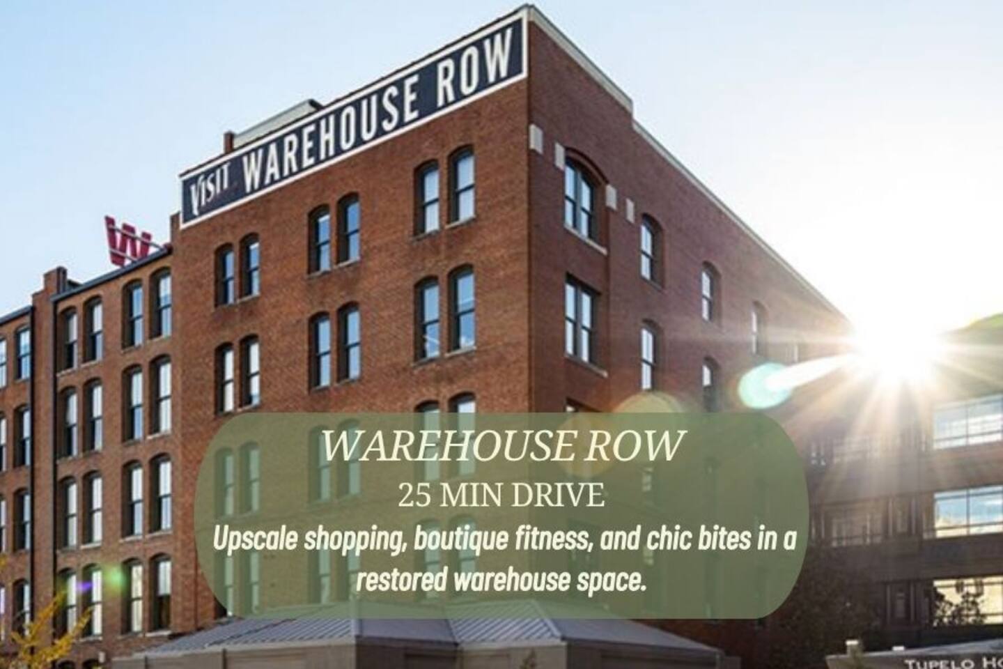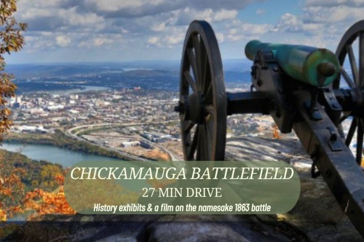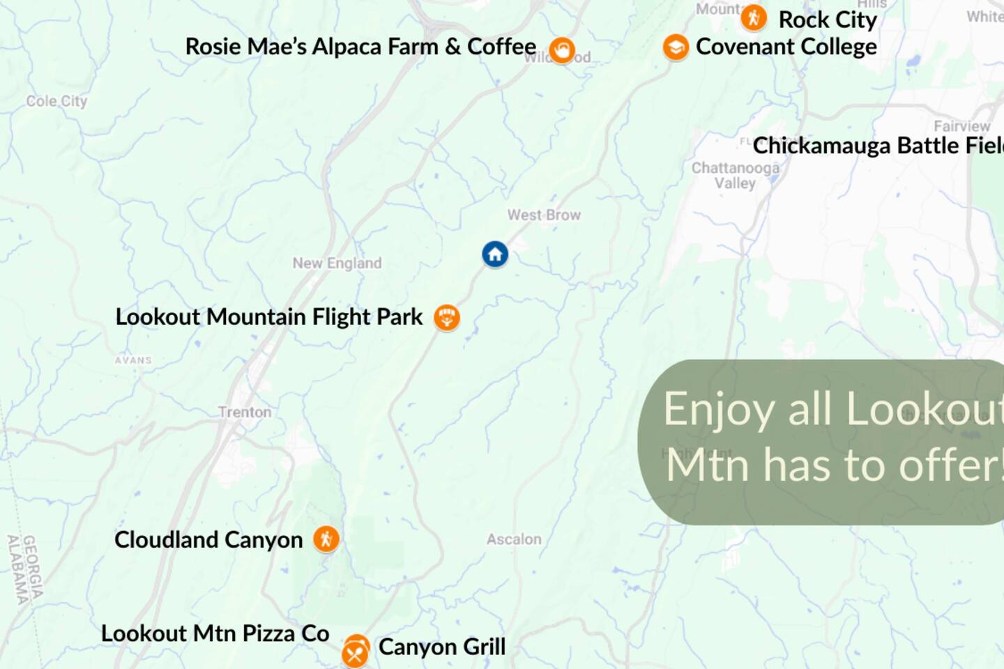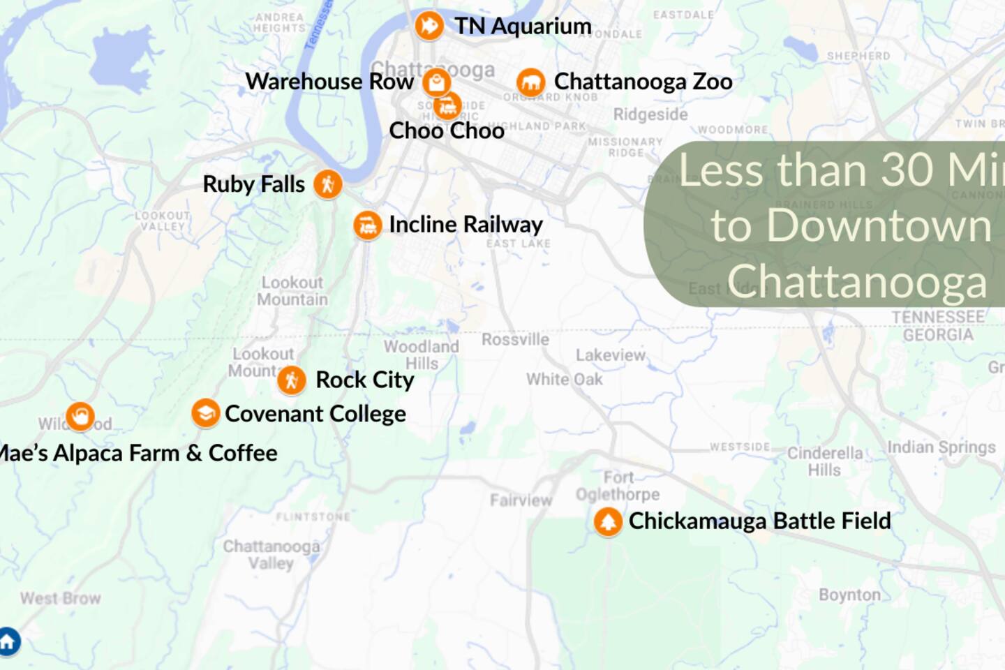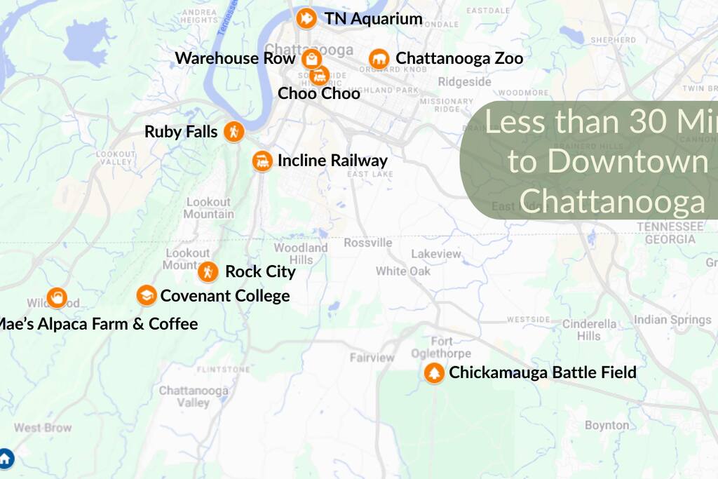CHATTANOOGA ATTRACTIONS: Lookout Mountain Incline Railway (10.2 miles), Hunter Museum of American Art (14.5 miles), Chickamauga & Chattanooga National Military Park (15.2 miles), Tennessee Riverpark (19.2 miles), Tennessee Valley Railroad Museum (21.3 miles) GET OUTSIDE: Lula Lake Land Trust (4.4 miles), Rock City Caverns (7.3 miles), Howard’s Waterfall Cave (8.1 miles), Cloudland Canyon State Park (9.7 miles), Ruby Falls (10.0 miles) FAMILY FUN: Wilderness Outdoor Movie Theater (8.7 miles), Creative Discovery Museum (13.9 miles), Tennessee Aquarium (14.3 miles), Chattanooga Zoo at Warner Park (15.4 miles), Lake Winnepesaukah Amusement Park (18.0 miles) RESTAURANTS & BREWERIES: Rock City’s Big Rock Grill (7.4 miles), Cafe On The Corner (7.5 miles), Susan’s Diner (9.3 miles), Mad Knight Brewing Company (10.2 miles), Heaven & Ale Brewing Company (13.1 miles), Wanderlinger Brewing Company (13.2 miles) AIRPORTS: Chattanooga Airport (21.2 miles), Huntsville International Airport (101 miles)