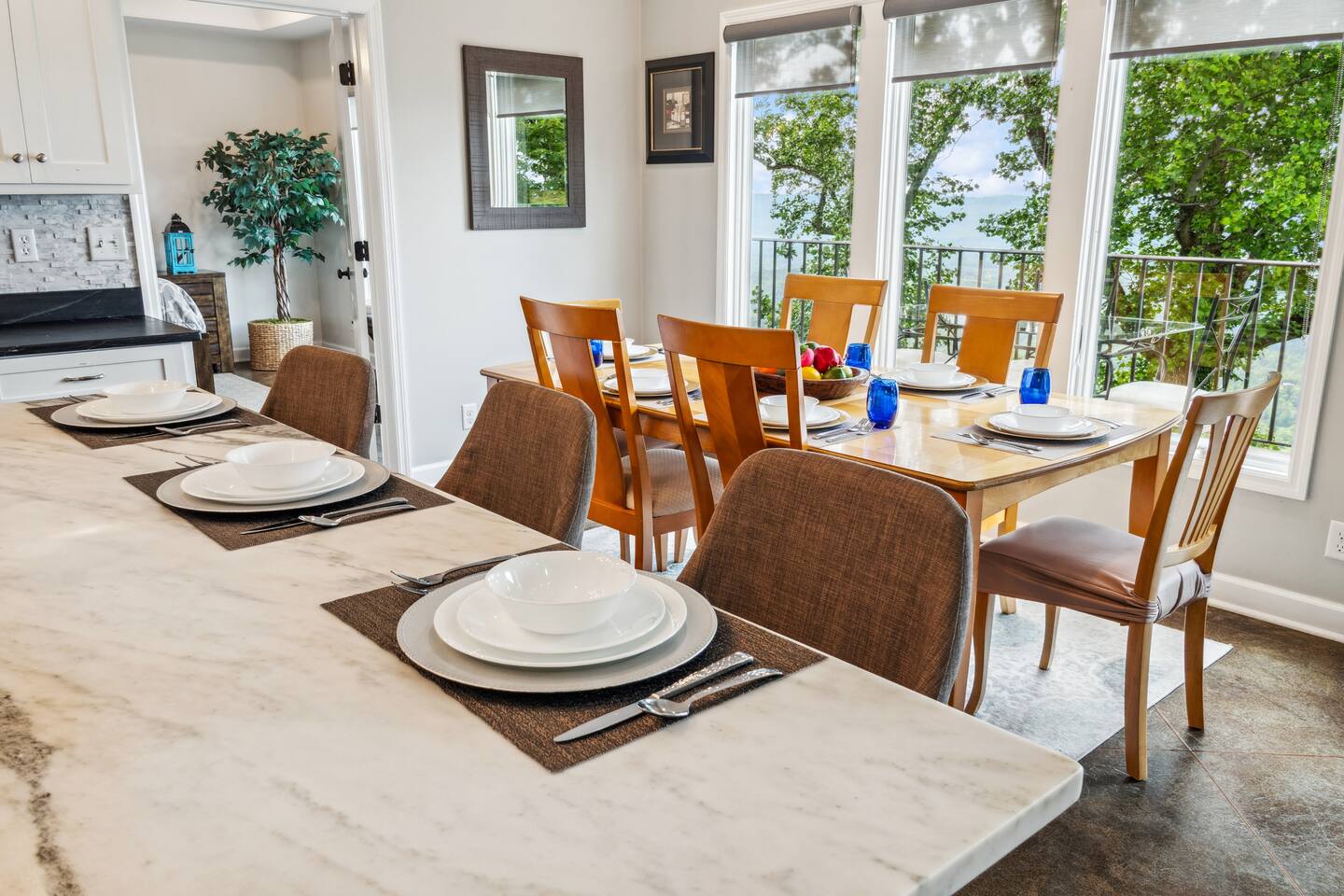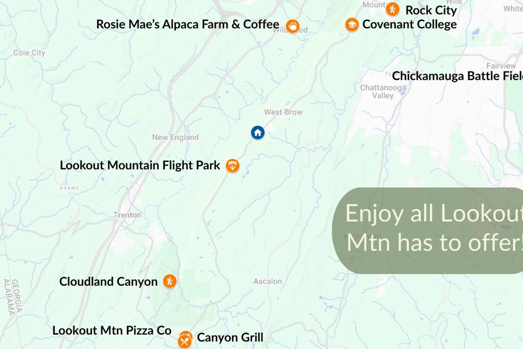 ✨ Your Scenic Sanctuary Awaits This warm, well-appointed home offers a peaceful mountaintop setting with thoughtful touches and unbeatable access to nature, adventure, and local charm. Whether you’re here to hike Cloudland Canyon, visit Covenant College, or explore Chattanooga, you’ll find comfort, style, and unforgettable views at every turn. ✨ Highlights: 📸 Back deck views you don’t want to miss – Be sure to check out the “Deck” section in the photo gallery! 🌄 Stunning valley views from every room 🍳 Open kitchen with all brand-new stainless appliances 🛁 Spa-style bathroom with soaking tub + mountain view 🔥 Outdoor living with fire pit, dining area & grill 🛏️ Plush beds, modern décor, and tons of natural light 🏡 MAIN LEVEL ☀️ Open-Concept Living with Panoramic Views Cook, dine, and unwind in a bright, open space where floor-to-ceiling windows frame Lookout Mountain Valley — from sunrise to sunset. 🍳 Fully Equipped Kitchen Ample counter space & full cookware for everything you need for cooking a meal or plating up that delicious delivery. Stainless steel appliances, air fryer, blender, drip coffee maker 🍽️ Dining Area Seats six comfortably, with additional bar seating and stunning views throughout. 🛋️ Cozy Living Room Sink into a plush sofa, enjoy a flat screen Smart TV, or simply take in the scenery with a cup of coffee or a good book. 🛏️ Bedroom 1 (King Bed + Ensuite) Spacious and serene, the primary suite features a luxurious king bed, calming decor, and a private bath — your personal retreat after a day of adventure. 🛏️ SECOND FLOOR Bedroom 2 (Queen Bed): Elegant and quiet — with breathtaking views to look at before you sleep and as you wake Bedroom 3 (Twin Beds + Futon): Sleeps up to 3 in this room - Just like the rest, this room offers amazing view of Lookout Valley 🌄 THE BACK DECK Soak in the mountain air and golden sunsets from your private bluff-side deck: Gas fire pit for stargazing & s’mores Outdoor dining - perfect for morning coffee or evening wine 🚗 PARKING & ACCESS Garage + driveway parking for up to 4 vehicles 📍 WHAT’S NEARBY Enjoy the best of Lookout Mountain, just outside your door: 🥾 Cloudland Canyon State Park – 10 min for epic hikes, waterfalls & canyon views 🎓 Covenant College – 4 min (just down the road!) 🪂 Lookout Mountain Flight Park – 5 min for hang gliding adventures 🪨 Rock City Gardens – 11 min for magical trails & views 🌊 Ruby Falls – 15 min to the underground waterfall 🚂 Incline Railway & Lookout Mountain Attractions – 15 min 🐠 Tennessee Aquarium – 25 min for top-rated family fun 🎶 Chattanooga Choo Choo & Southside Arts District – 25 min 🛍️ Warehouse Row – 25 min for boutique shopping & dining 🍕 Lookout Mountain Pizza Company – 7 min for local flavor 🥩 Canyon Grill – 12 min for upscale Southern eats 🌲 Nestled along the iconic Scenic Highway, this peaceful retreat feels a world away—yet you're just 13 scenic miles from downtown Chattanooga. Whether you're chasing waterfalls, exploring caves, or enjoying fireside s’mores, this home is the perfect basecamp