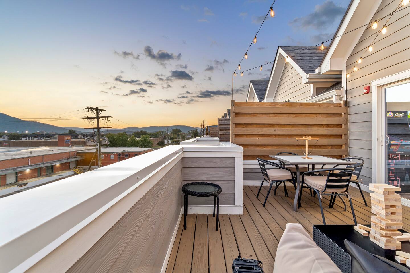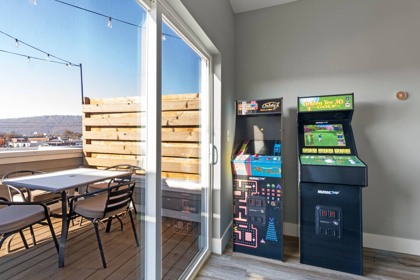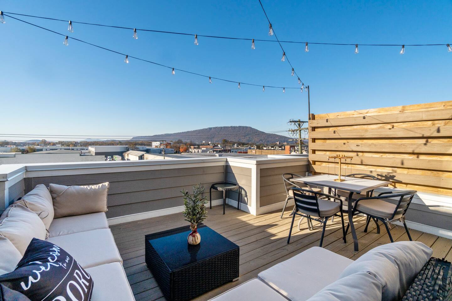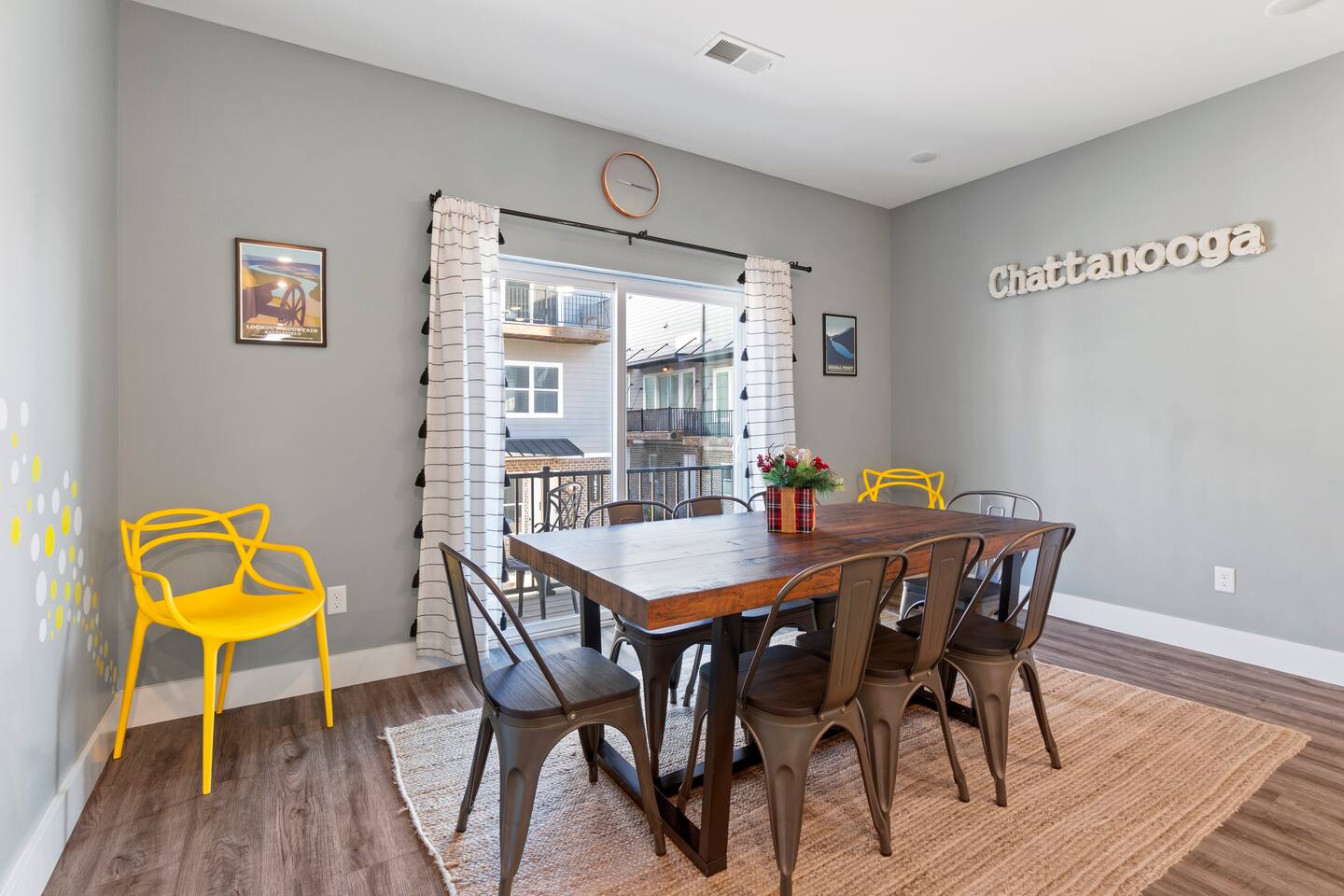 Inside, enjoy a cozy retreat with everything you need for a stress-free stay. 🏠 Home Layout ENTRANCE LEVEL * Queen bed with ensuite bathroom * Laundry area * 1 Vehicle garage access for easy parking SECOND LEVEL * Fully equipped kitchen with modern appliances * Patio off the kitchen, great for morning coffee * Spacious living room with plenty of seating for the whole group THIRD LEVEL * Main suite with king bed, ensuite bathroom, and dedicated workspace * Queen bedroom with access to a shared full hallway bathroom FOURTH LEVEL * Queen bedroom * Loft area leading to a stunning rooftop patio with dining table, lounge seating, and panoramic views—ideal for evening cocktails or stargazing ROOFTOP PATIO * w/ comfy couches, dining table, and fun games! Take in the best of both worlds - the hum of the industrial Southside — while gazing out toward the calm majesty of Lookout Mountain in the distance ☀️ Outside, experience a neighborhood where Southside’s vibrancy, Chattanooga’s history, and the energy of local businesses all come together. 🚲 Short drive to the Tennessee Aquarium, Children’s Discovery Museum & Riverfront 🎨 Colorful murals, art, and a lively industrial backdrop Oddstory Bewing - Next to townhouse complex Scoop Around Ice Cream - 6 min walk Shady's Corner - 7 min walk Velo's Coffee - 2 min drive Niedlov's Bakery - 3 min drive Chattanooga Choo Choo - 5 min Whether it’s a weekend getaway or a longer stay, this Southside spot is the perfect home base for your family & friends.