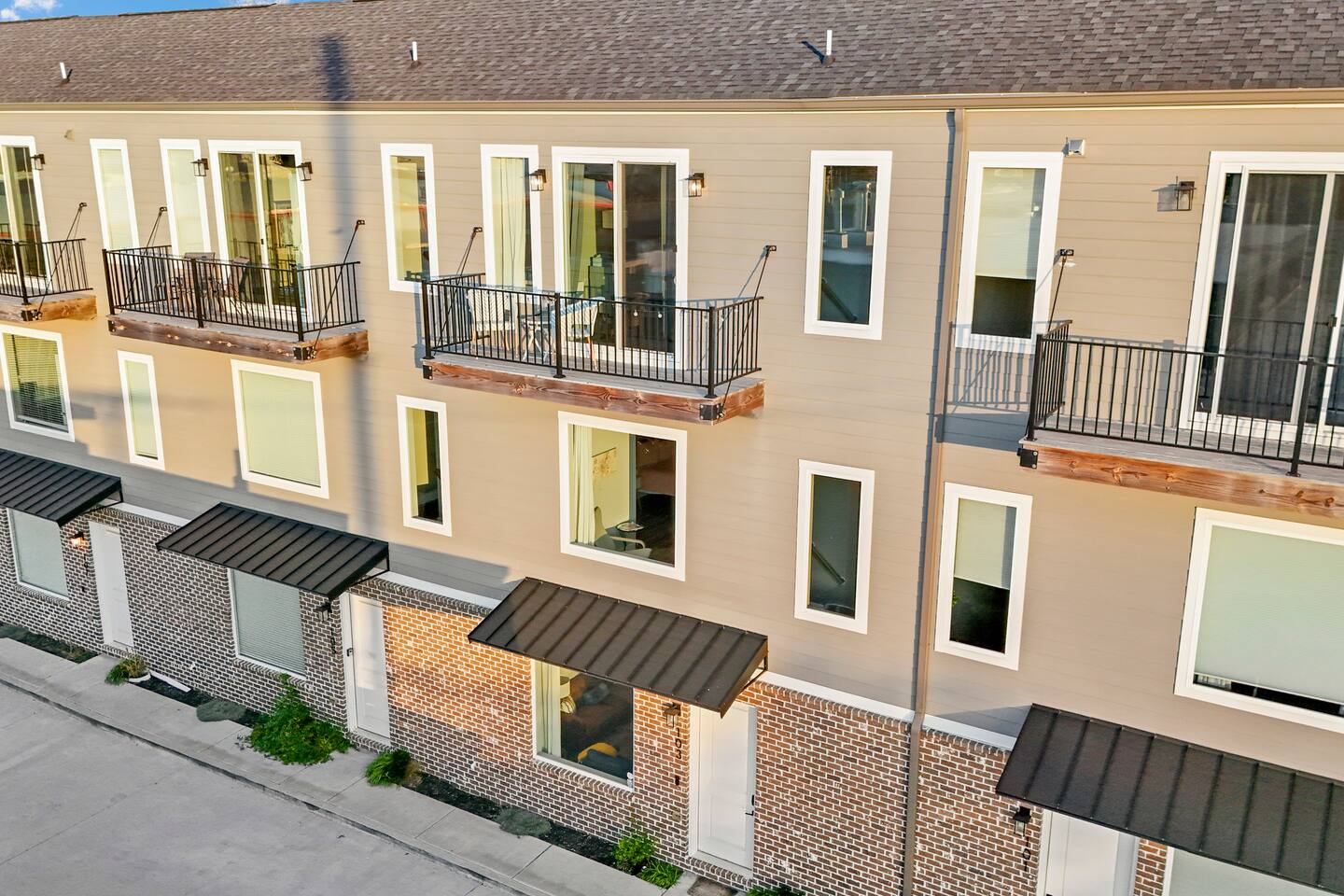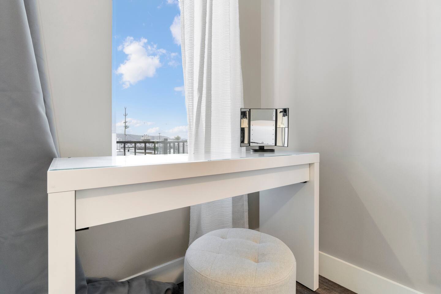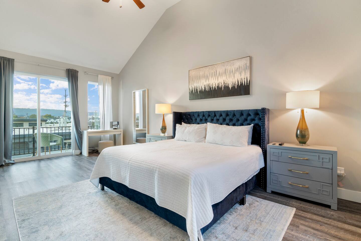 The first floor boasts a mid-century modern themed living room with comfortable seating, 10 ft ceilings, board games, xbox, TV, and more. You have a half bath as well as a full kitchen and table for eating. We provide you with cookware and appliances so you can prepare your own meals if you would like. We also provide our guests with some coffee, snacks, and beverages for those late night cravings! As you move to the second floor, you come to the first bedroom featuring a queen size bed, private sitting area with beautiful views of the Chattanooga valley mountains, your own private bathroom, walk-in closet, dresser and TV! You also have your own outdoor balcony overlooking the courtyard. As you move up to the third floor, you will find our Master Suite with a king size bed, two night drawers for storing your clothes or other items, 50" TV, and a walk-in closet with washer/dryer that you can use (free of charge). We have also provided you with two luxurious robes to use during your stay! When you wake up, start your day with a cup of coffee on your private outdoor balcony overlooking the Southside and panoramic views of Lookout and Signal Mountains! As you get ready for your day, use the in-room vanity which can also double as as desk if you need.
