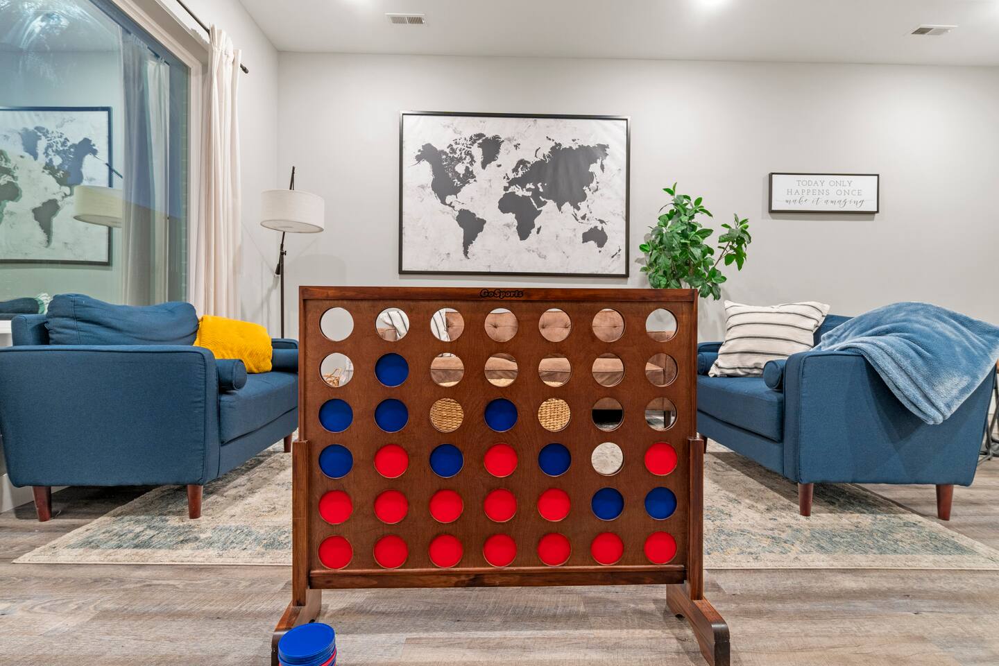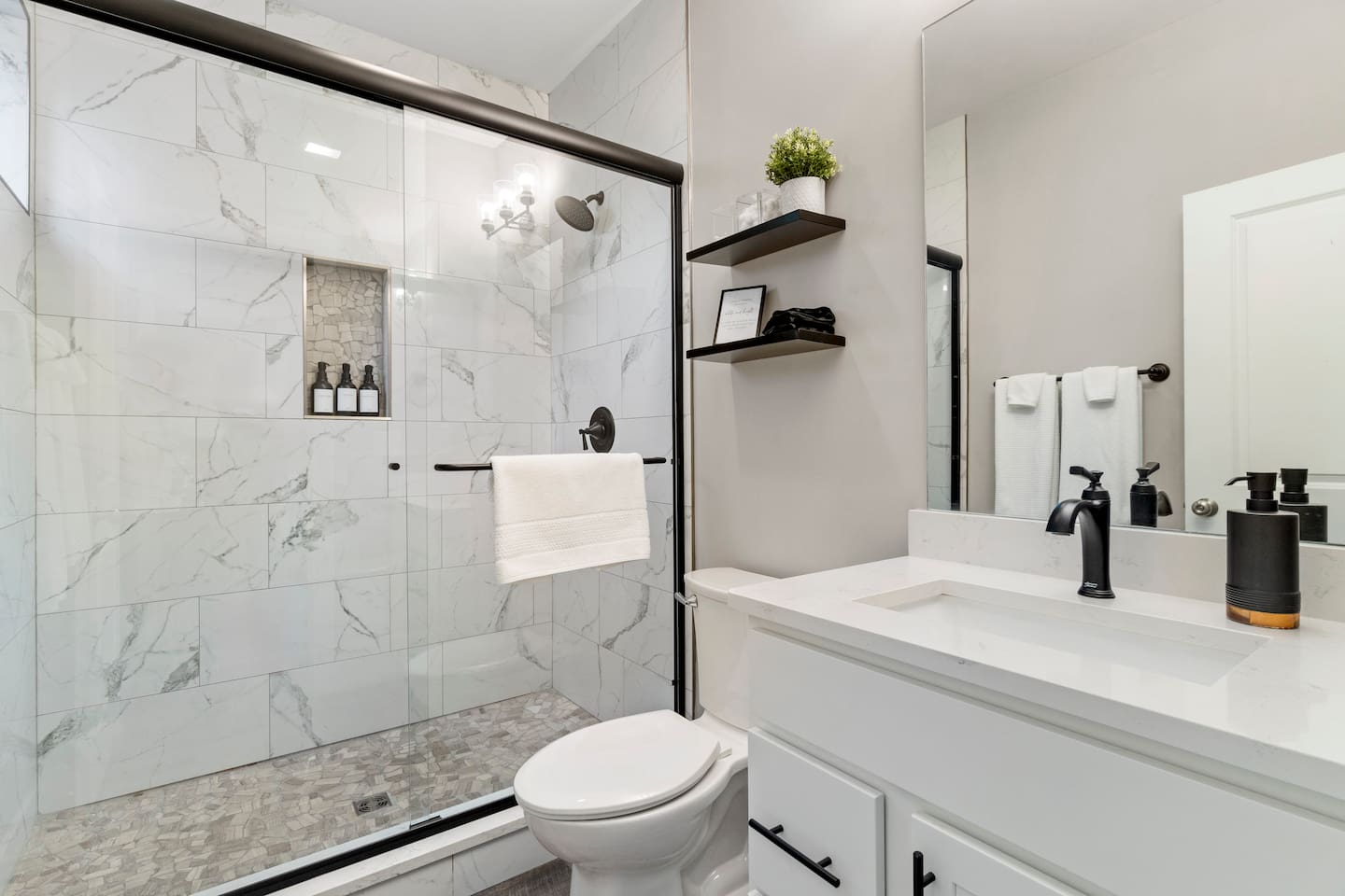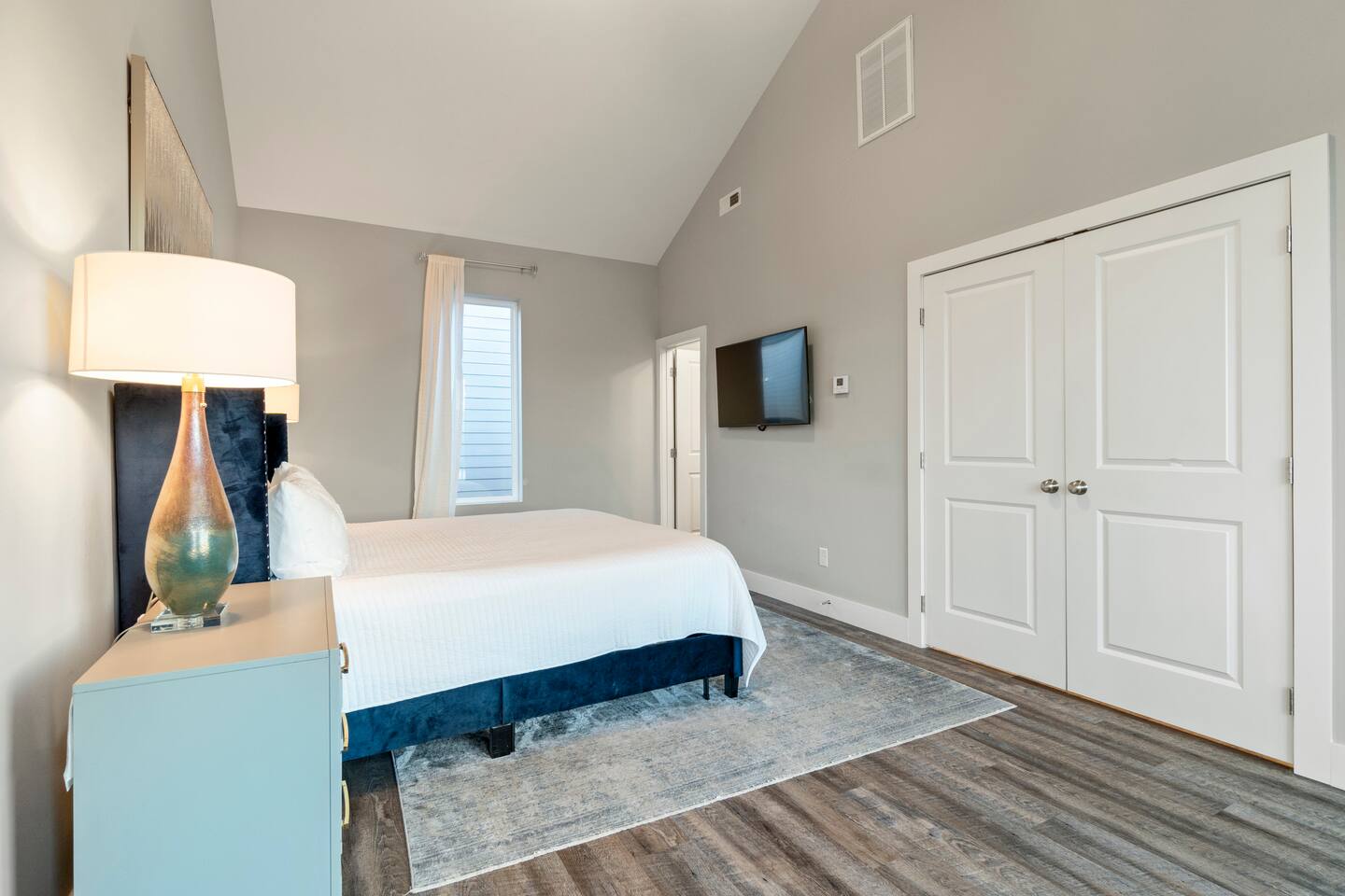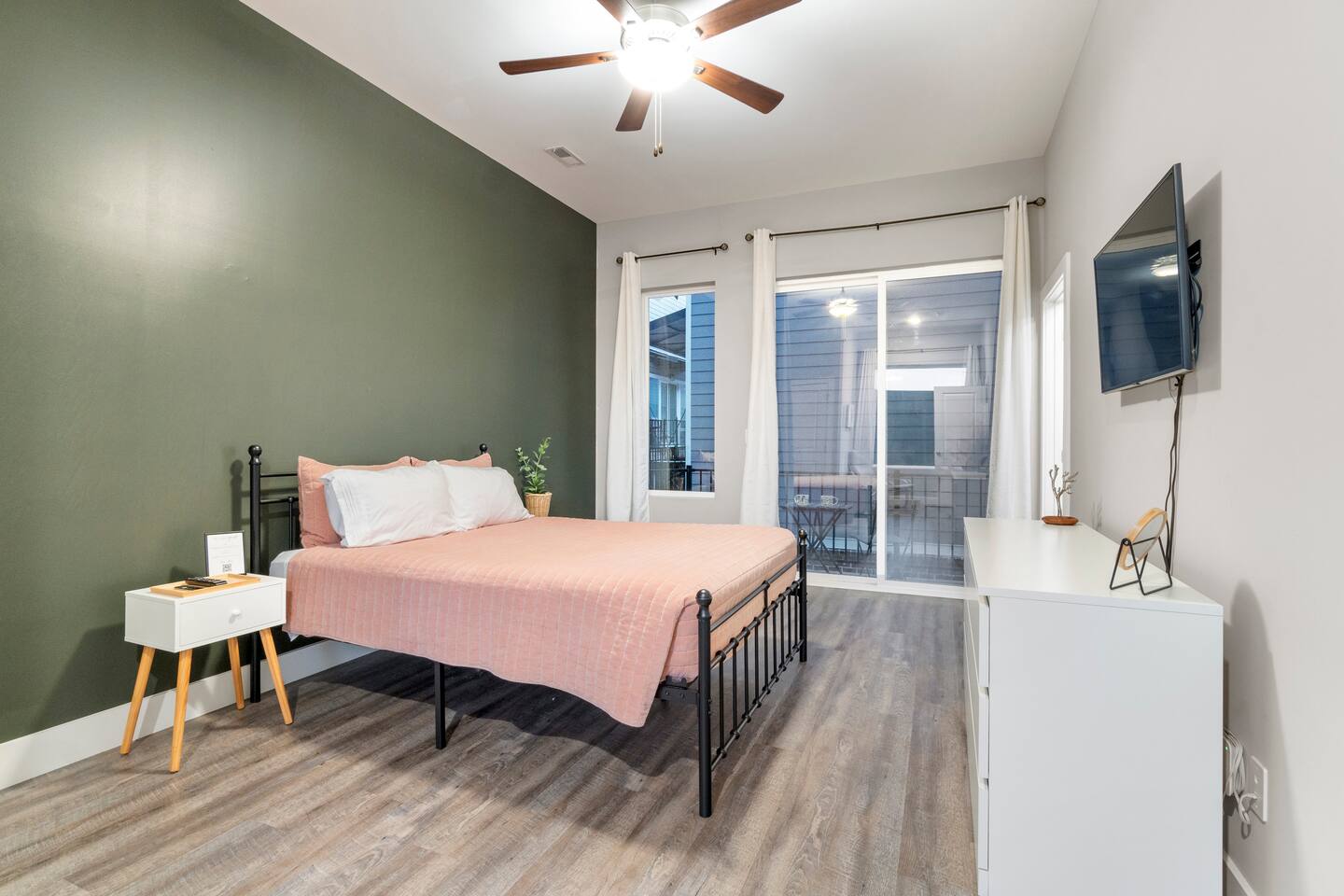 The first floor boasts a mid-century modern themed living room with comfortable seating, 10 ft ceilings, board games, xbox, TV, and more. You have a half bath as well as a full kitchen and table for eating. We provide you with cookware and appliances so you can prepare your own meals if you would like. We also provide our guests with some coffee, snacks, and beverages for those late night cravings! As you move to the second floor, you come to the first bedroom featuring a queen size bed, private sitting area with beautiful views of the Chattanooga valley mountains, your own private bathroom, walk-in closet, dresser and TV! You also have your own outdoor balcony overlooking the courtyard. As you move up to the third floor, you will find our Master Suite with a king size bed, two night drawers for storing your clothes or other items, 50" TV, and a walk-in closet with washer/dryer that you can use (free of charge). We have also provided you with two luxurious robes to use during your stay! When you wake up, start your day with a cup of coffee on your private outdoor balcony overlooking the Southside and panoramic views of Lookout and Signal Mountains! As you get ready for your day, use the in-room vanity which can also double as as desk if you need.